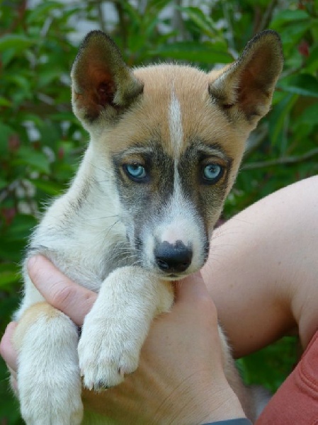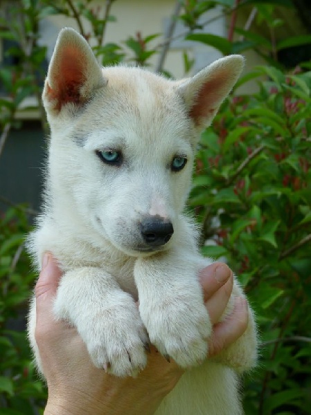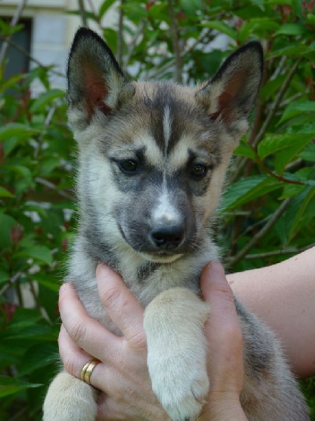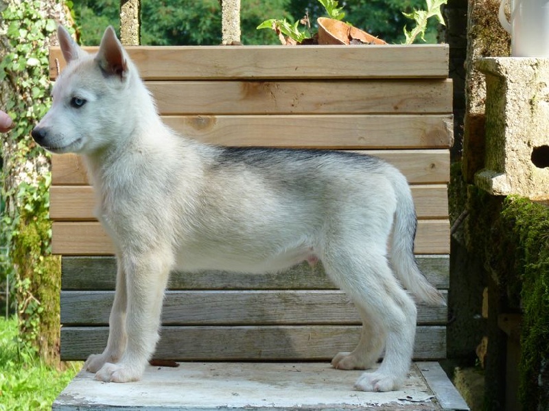 Gris foncé et blanc/ yeux marrons ; partira à Vanzy faire du mushing!